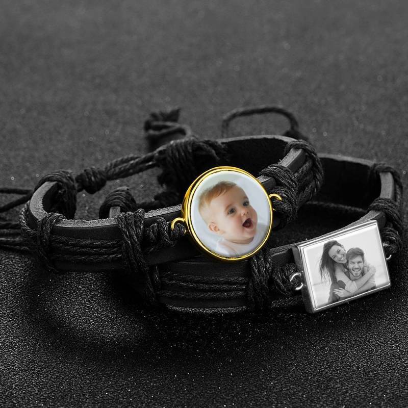 Foto Armband, Andenken Geschenk Schwarzes Leder Runde 14 Gold Vergoldet Golden - Bunt