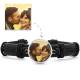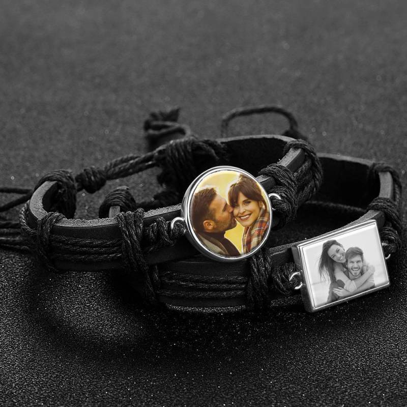 Foto Armband, Andenken Geschenk Schwarzes Leder Runde Silber Platiniert - Bunt