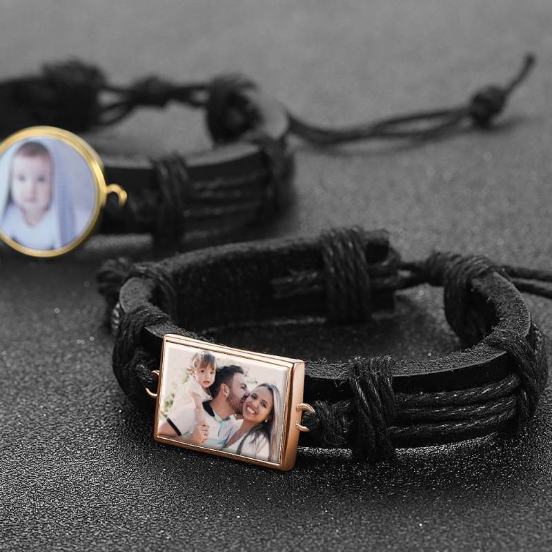 Foto Armband, Andenken Geschenk Schwarzes Leder Quadratisches Rose Vergoldet - Bunt