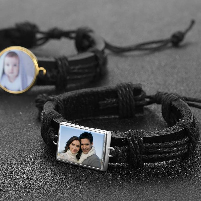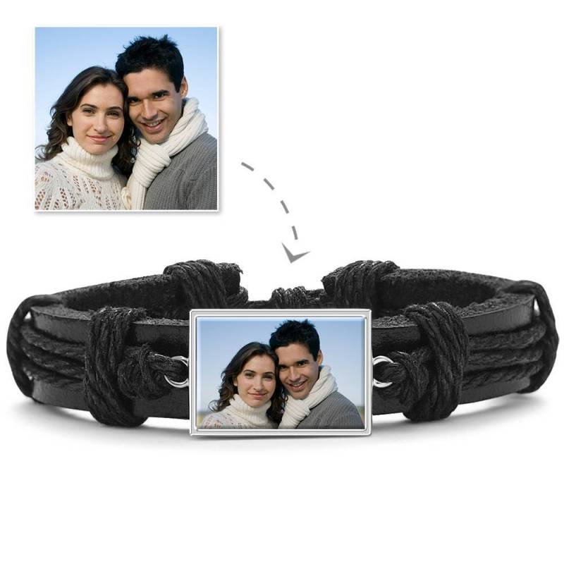 Foto Armband, Andenken Geschenk Schwarzes Leder Quadratisches Silber Platiniert - Bunt