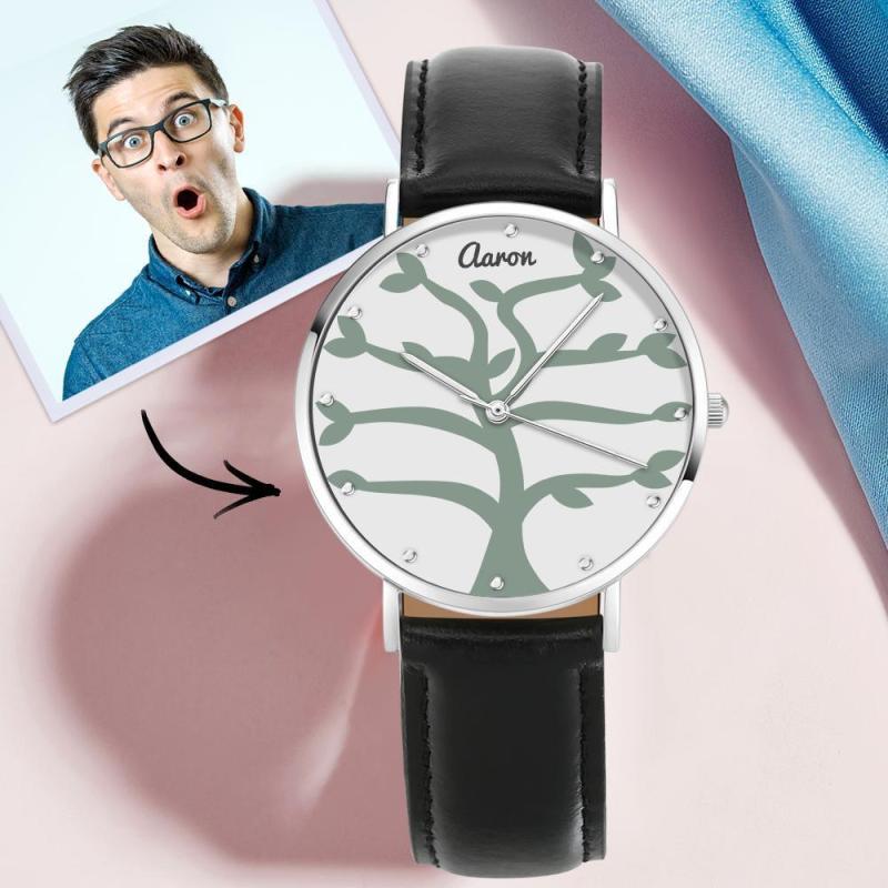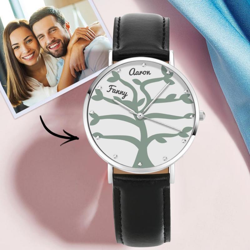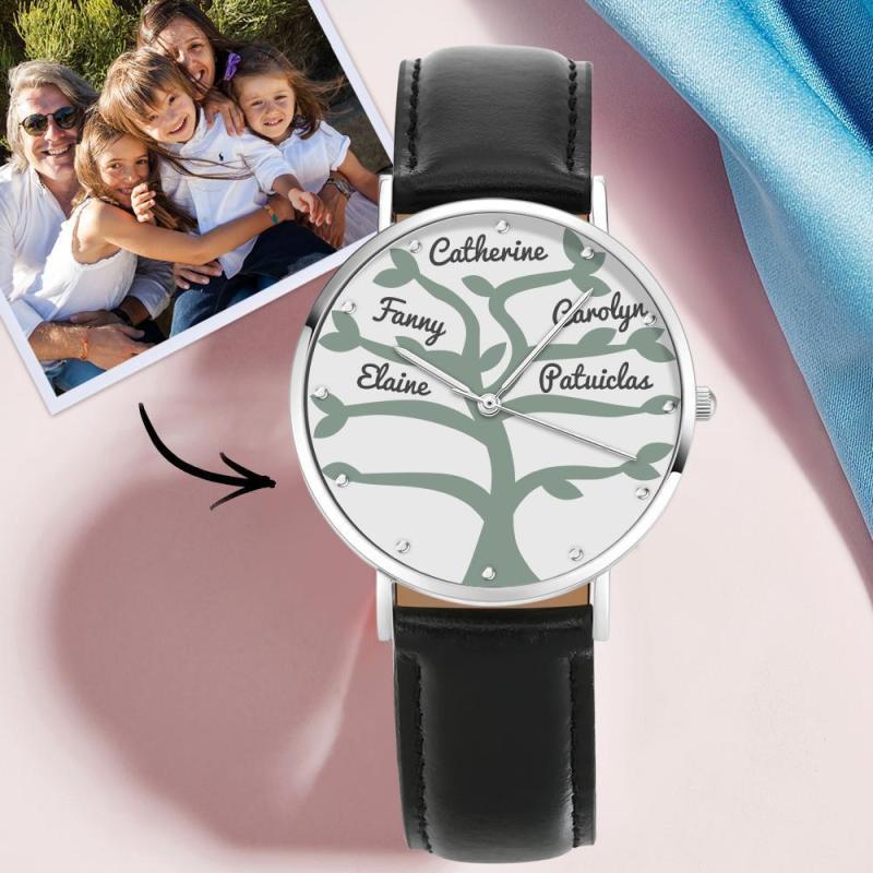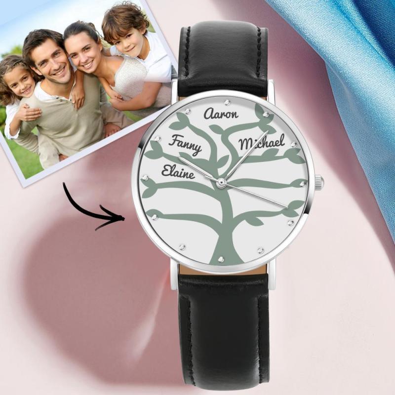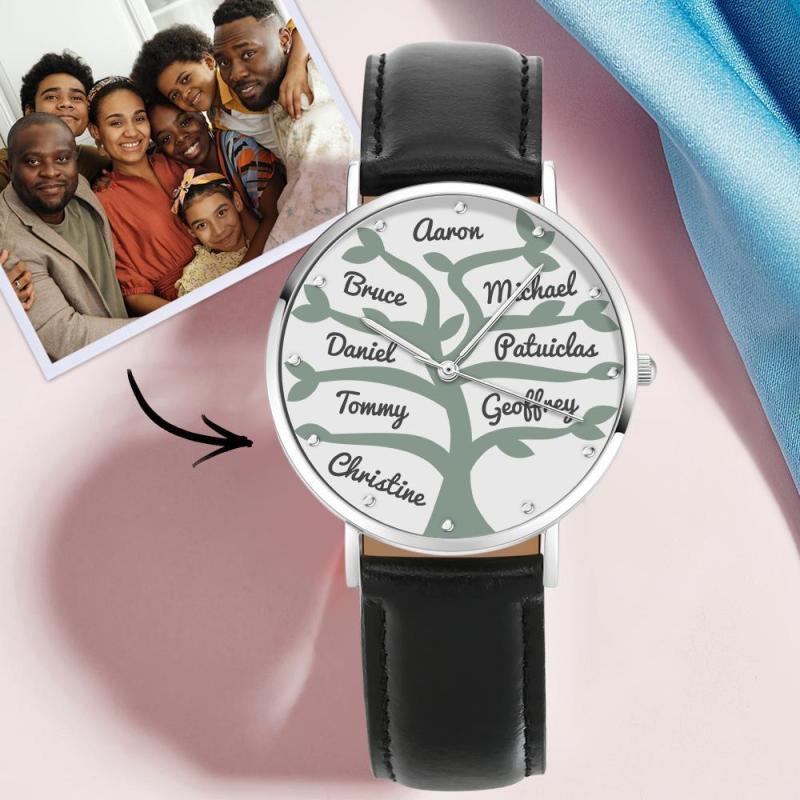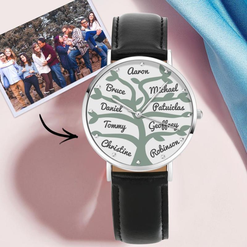 Namensuhr Mit Schwarzem Lederarmband 40Mm Für Die Familie (1-9 Namen)