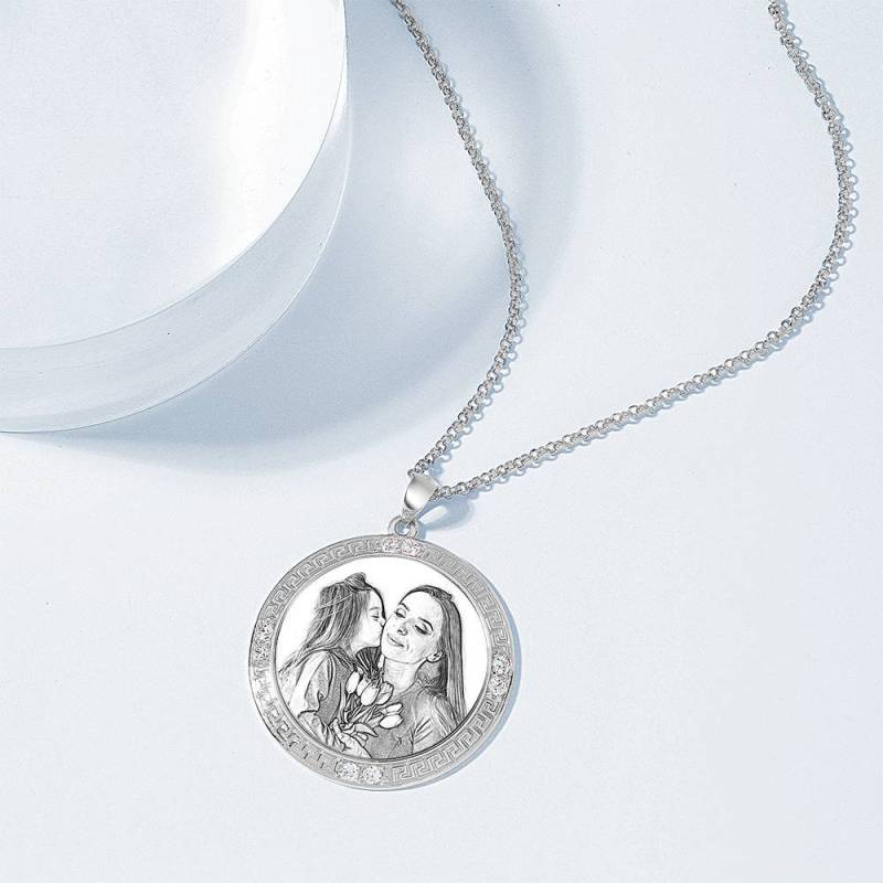 Herren Personalisierte Foto Gravierte Halskette, Strass Kristall Runde Form Foto Halskette Platiniert Silber - Skizze