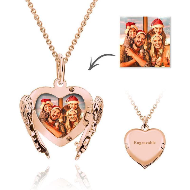 Gravierbare Foto Medaillon Halskette Herz Engelsflügel Sterling Silber