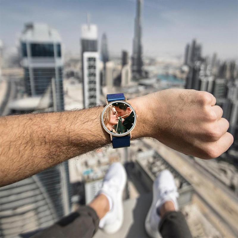 Personalisierte Gravierte Uhr, Fotouhr mit Blauem Armband - Geschenk für Freund