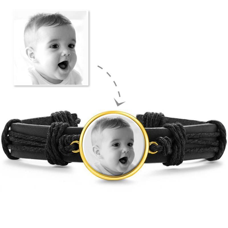 Foto Armband, Andenken Geschenk Schwarzes Leder Runde 14 Gold Vergoldet Golden - Fotokopieren