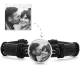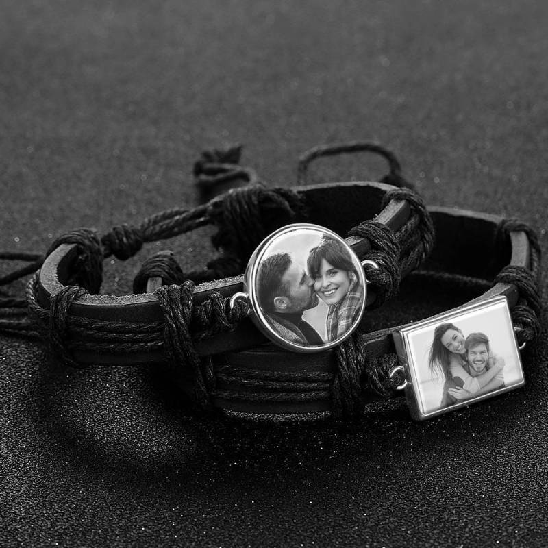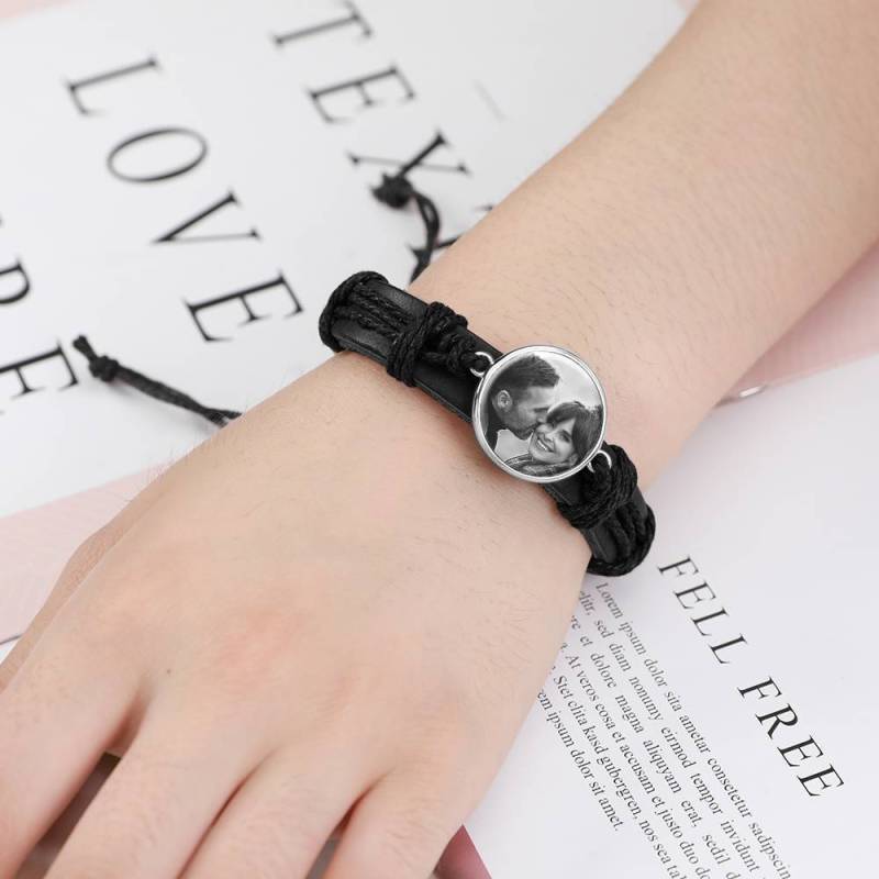 Foto Armband, Andenken Geschenk Schwarzes Leder Runde Silber Platiniert - Fotokopieren