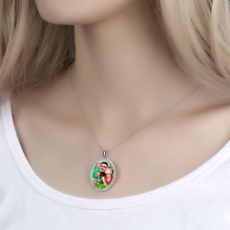Damen Personalisierte Foto Graviert Halskette, Strass Kristall Oval Form Foto Halskette Platin Plattiert Silber - Colorful