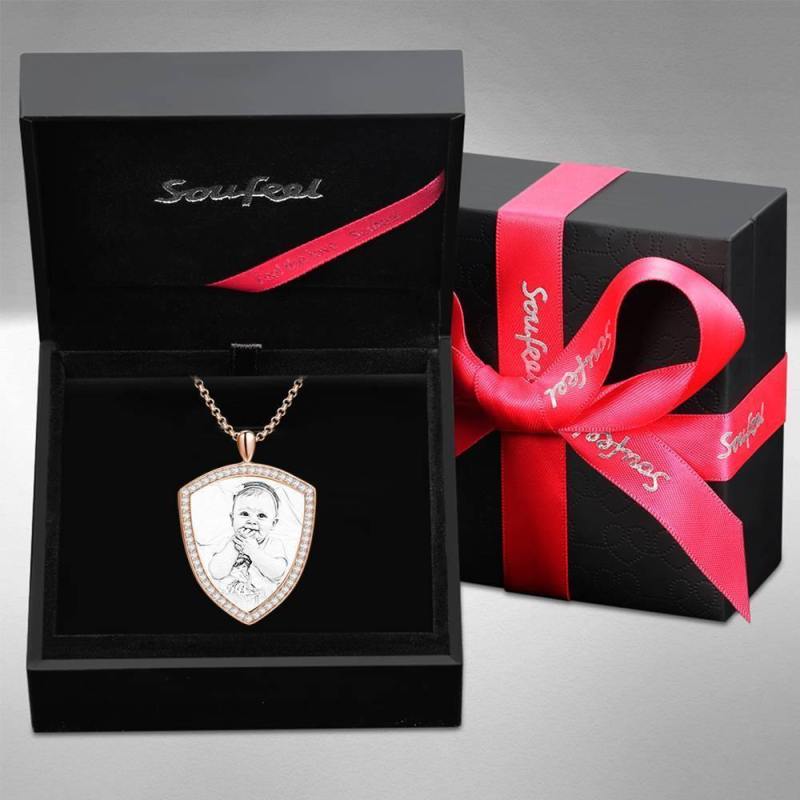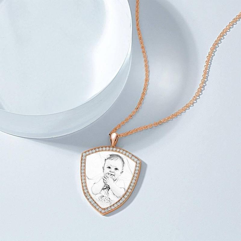 Frauen Personalisierte Foto Graviert Halskette, Strass Kristall Schild Form Foto Halskette Rose Gold Plattiert - Sketch