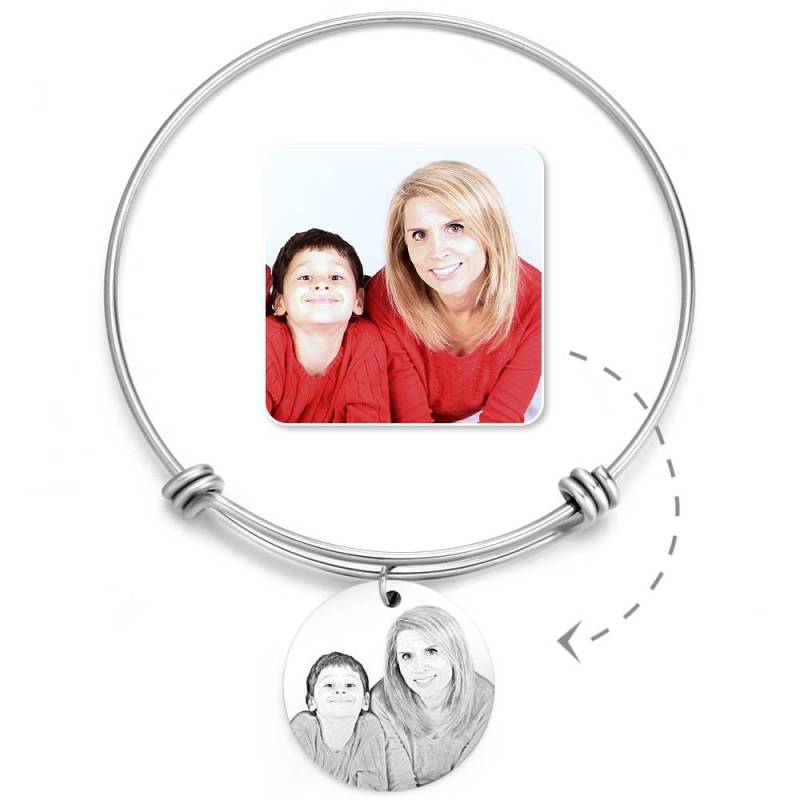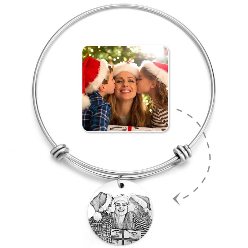 Women's Round Photo Engraved Charm Bangle Stainless Steel For Her