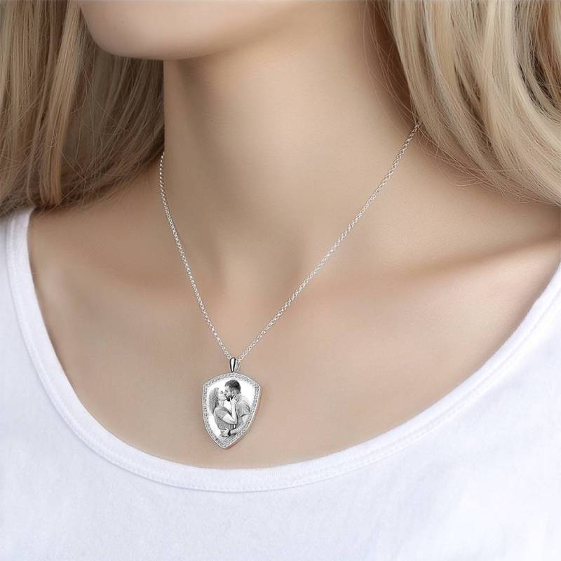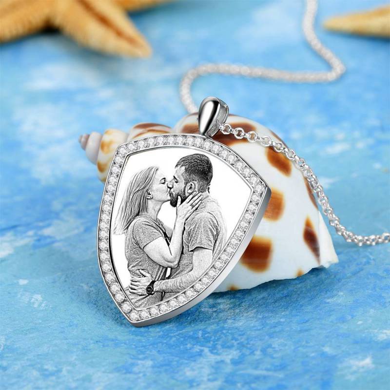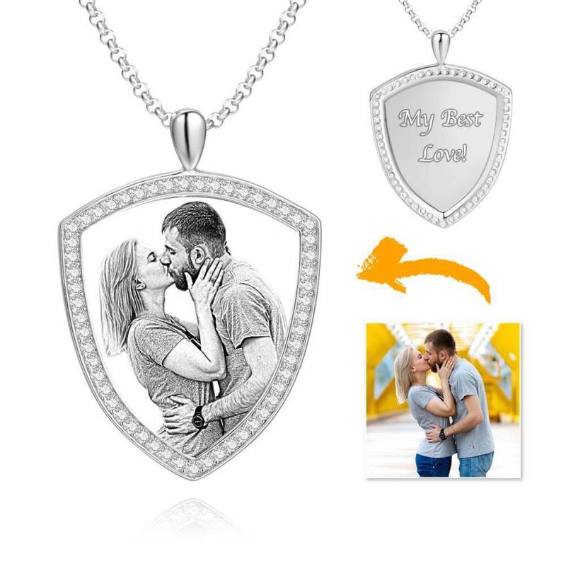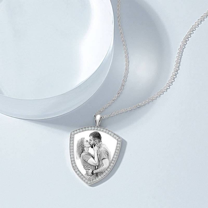 Frauen Personalisierte Foto Gravierte Halskette, Strass Kristall Schildform Foto Halskette Platiniert Silber - Skizze